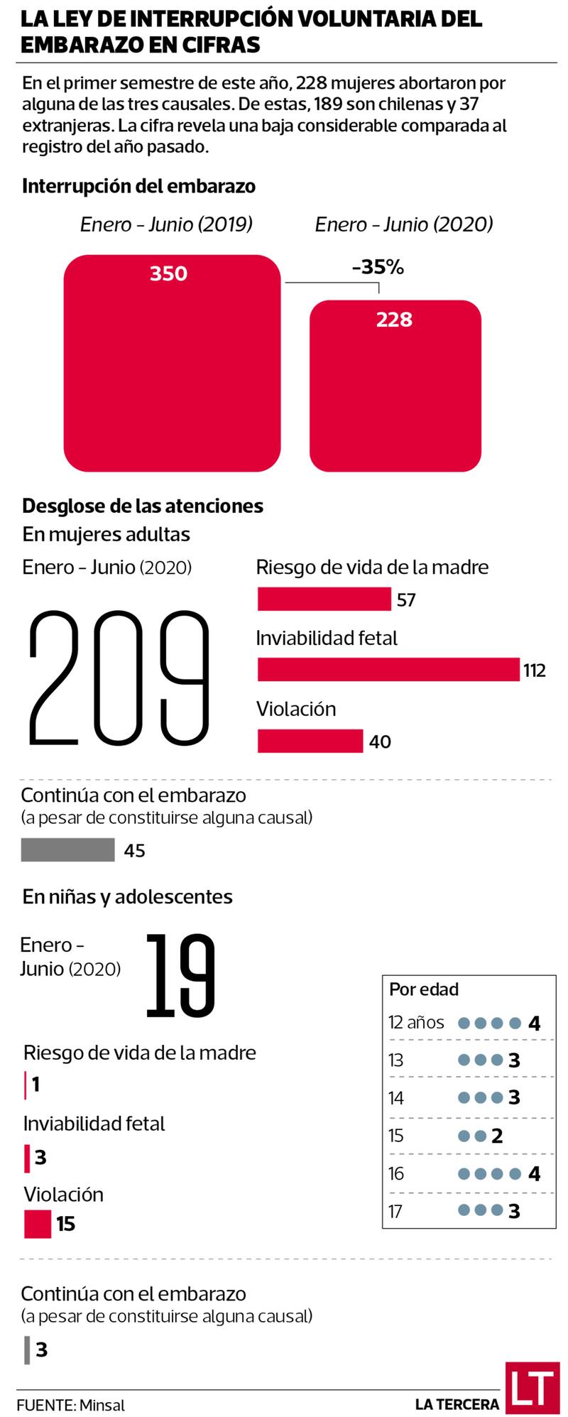 Y según las cifras del Ministerio de Salud -entregadas a La Tercera a través de Transparencia-, el balance del primer semestre revela que 228 mujeres optaron por interrumpir sus embarazos, de un total de 273 gestaciones enmarcadas en alguna de las categorías.