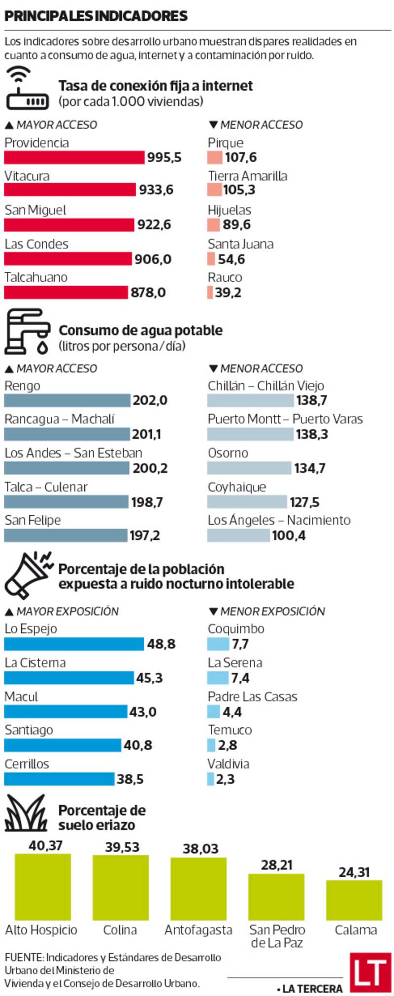 Los últimos indicadores publicados por el Consejo Nacional de Desarrollo Urbano y el Ministerio de Vivienda muestran las desigualdades y la evolución de las 117 comunas que tienen más de 50 mil habitantes.