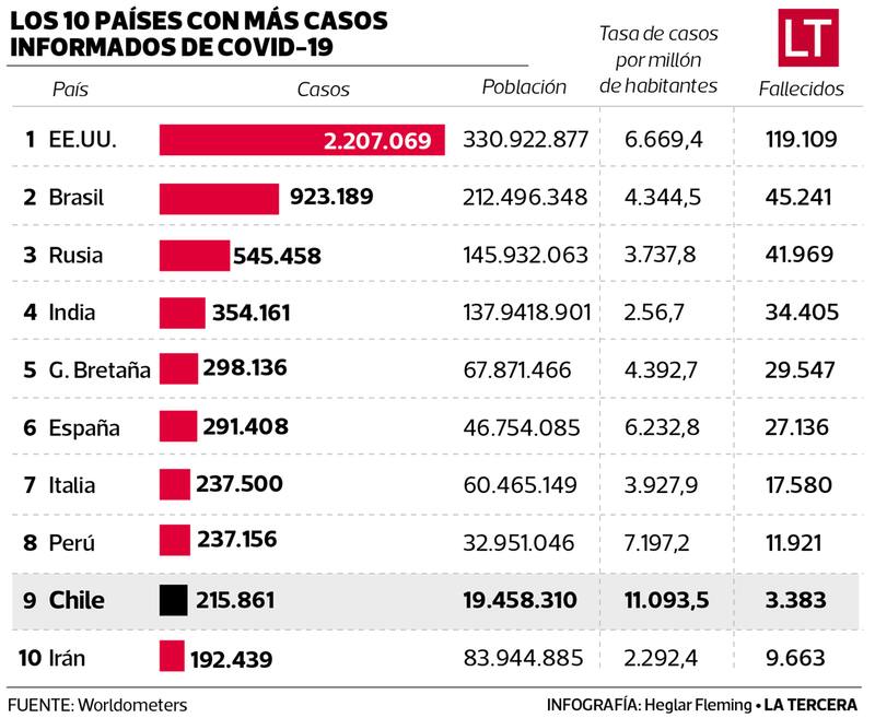 Además, la adición convierte a Chile en el noveno país que ha superado los 200 mil casos informados de manera oficial, sumándose a Estados Unidos, Brasil, Rusia, India, Reino Unido, España, Italia y Perú, de acuerdo a la estadística de Worldometers. El décimo en la lista es Irán. Todos esos países tienen mayor cantidad de habitantes que el nuestro.