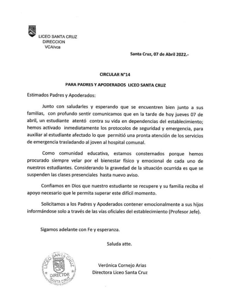 Posterior a este hecho, la directora del Liceo Santa Cruz, Verónica Cornejo, emitió un comunicado donde se menciona que “hemos activado inmediatamente los protocolos de seguridad y emergencia, para auxiliar al estudiante afectado lo que permitió una pronta atención de los servicios de emergencia trasladando al joven al hospital”.