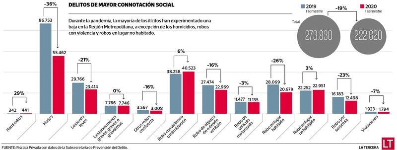 En cambio, el robo en lugar habitado -residencias- experimentó una baja de un 26%, pasando de 28 mil casos en el primer semestre de 2019 a 20 mil en ese mismo lapso de 2020. La caída fue todavía mayor para los hurtos, ilícito que registró una baja de un 36%, variando de 86 mil casos a 55 mil. También experimentaron una importante disminución los robos por sorpresa -lanzazos- (-23%) y las lesiones (-21%).