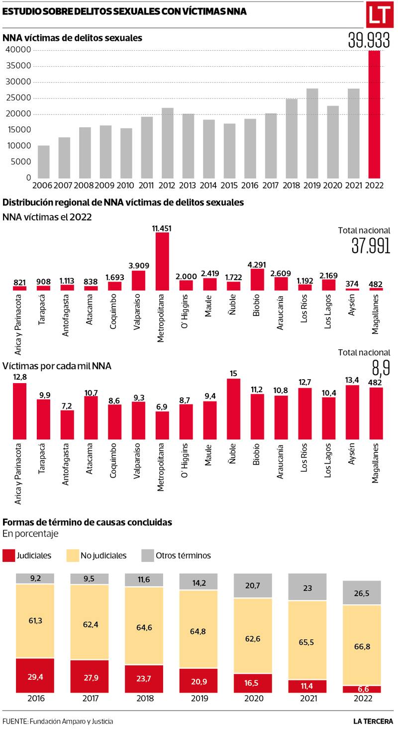 El informe de la fundación, elaborado a partir de cifras del Ministerio Público obtenidos a través de la Ley de Transparencia, expone que durante el 2022 se recibieron 39.933 denuncias por delitos sexuales en los que la víctima era un NNA. La cifra, es un 42% mayor respecto a los 28.056 casos que se registraron durante el 2021. El número también refleja un máximo histórico de denuncias, superando el umbral de las 30 mil causas que se habían producido en este tipo de delitos en los años anteriores.
