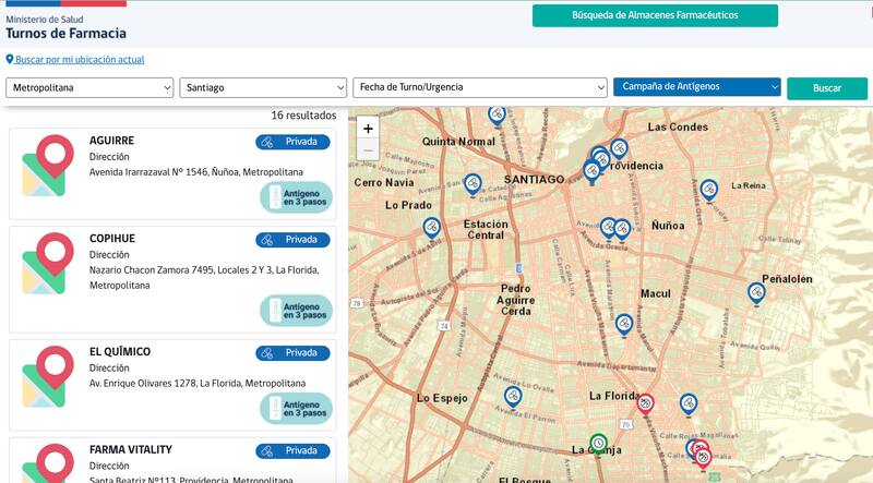 Para encontrar las farmacias adheridas que cuentan con el test, desde el Minsal han habilitado un mapa georeferencial. Para esto, se debe acceder al sitio web Turnos de Farmacia (www.turnosdefarmacia.cl) y filtrar por “Campaña de Antígeno”. Al momento 498 farmacias cuentan con este kit, y esta cifra aumentará hasta superar las mil en las próximas semanas.
