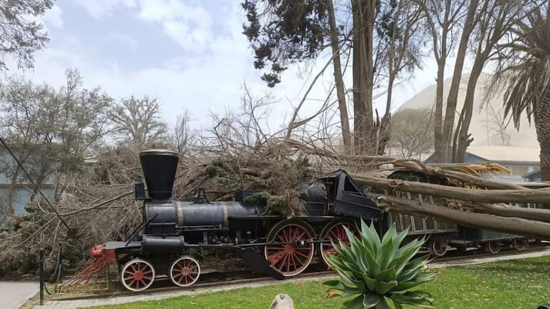 Árbol cae sobre la primera locomotora de Chile tras fuertes vientos en Copiapó