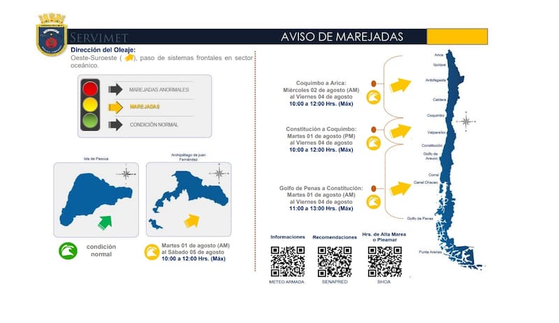 El Centro Meteorológico Marítimo de Valparaíso, de la Armada, emitió un aviso de marejadas que se presentarán desde Arica hasta el sector del Golfo de Penas, incluyendo Juan Fernández, del oeste suroeste.