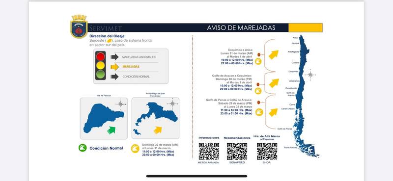 El Centro Meteorológico Marítimo de la Armada, ubicado en Valparaíso, reportó que se registrarán marejadas desde el sector de Golfo de Penas hasta Arica y Archipiélago Juan Fernández, a contar del sábado 29 de marzo hasta el martes 01 de abril, alcanzando su mayor desarrollo en las respectivas horas de pleamar o alta marea y según las condiciones de viento local.