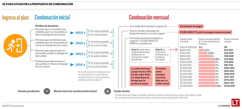 Para esto habrá pasos que dar. Lo primero es ingresar al plan. Luego cada persona será categorizada en uno de los cuatro perfiles de deudor: desertores con y sin cuotas pendientes, y egresados con y sin cuotas pendientes. Cada uno de esos perfiles tiene un monto base de condonación en UF. En el caso de la persona que no terminó sus estudios y está al día son 60; la persona que no terminó sus estudios y está en mora son 30; la persona que egresó y está al día son 40, y la persona que egresó y está en mora son 20.