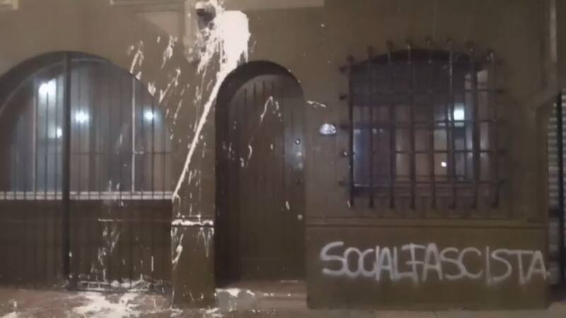 En la fachada del inmueble escribieron “traidores” y “social fascista” junto a un dibujo de la representación de una estrella con una A en el centro.