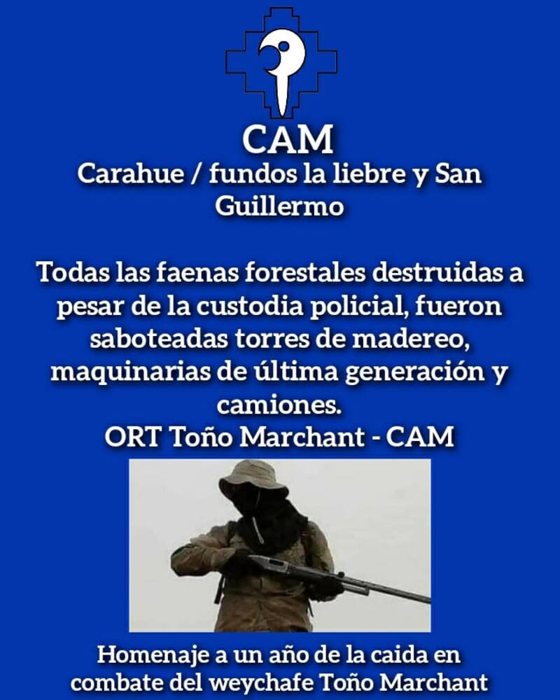 En redes sociales se publicó un mensaje del Órgano de Resistencia Territorial (ORT) “Toño” Marchant de la CAM en que el grupo se adjudica los recientes hechos de violencia como ”homenaje” a un año de su muerte.