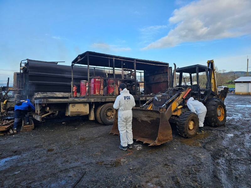 “En el lugar un grupo indeterminado de sujetos ingresa a dependencias de la empres constructora Tricam, intimidando al guardia, para posteriormente incendiar diversa maquinaria. En el lugar se encontró un lienzo adjudicatorio”, señaló el inspector de la PDI Felipe Godoy.
