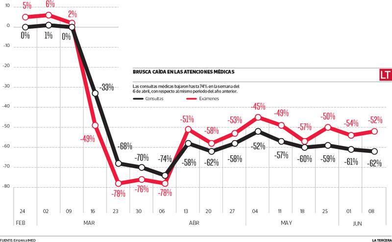 Pero eso no estaría ocurriendo. Según un análisis de IMED, la empresa que permite la emisión de bonos a través de la huella digital electrónica, en la primera semana de junio se realizaron 220 mil consultas médicas en todo el país; es decir, 62% menos que las 570 mil que se hicieron el año pasado a la misma fecha.
