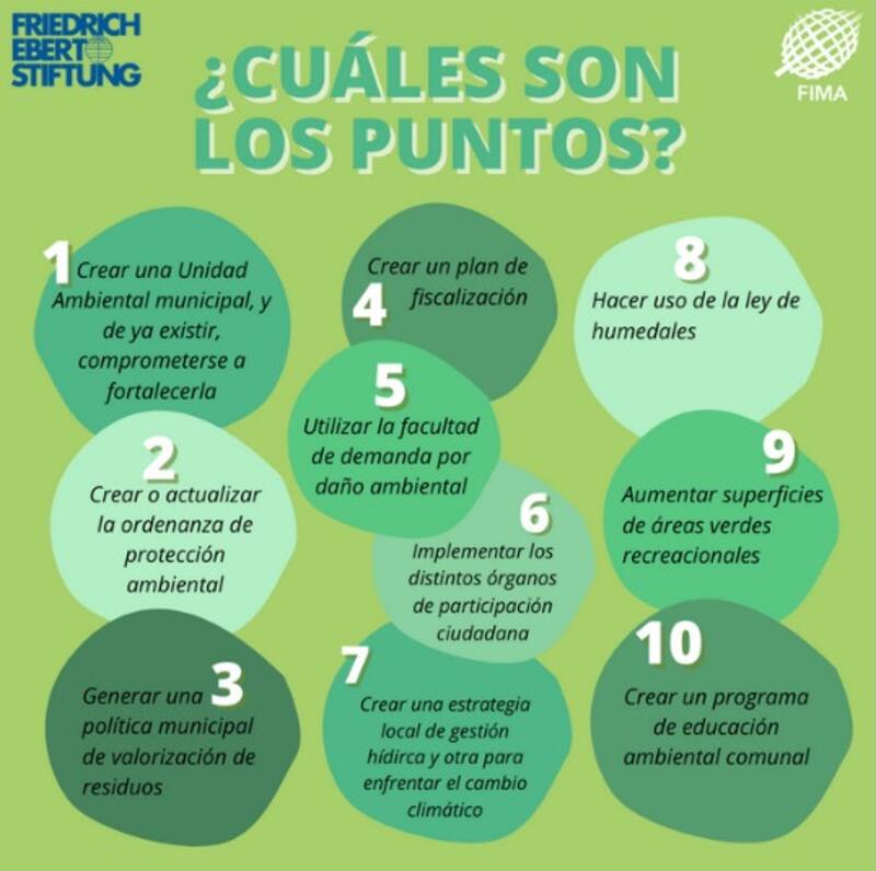 La iniciativa “Compromiso Municipio Verde”, que contiene 10 puntos, es una campaña lanzada por la ONG FIMA y la Fundación Friedrich Ebert (FES) con el objetivo de mejorar la calidad ambiental y que pueden realizarse desde las facultades de una municipalidad.