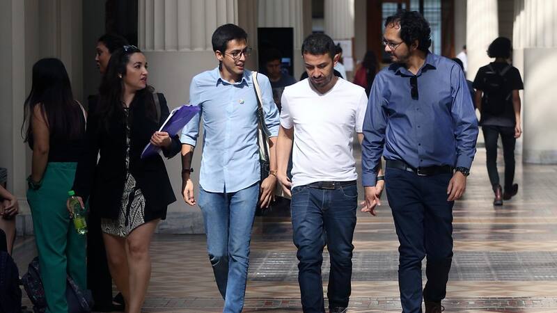 Ramón Gómez y Gonzalo Velásquez, dos de los cinco autores del bullado libro "Nicolás tiene dos papás", asistieron hoy a la Corte de Apelaciones para presentar un recurso de protección contra el Registro Civil, luego de que el servicio les negara una hora de matrimonio.