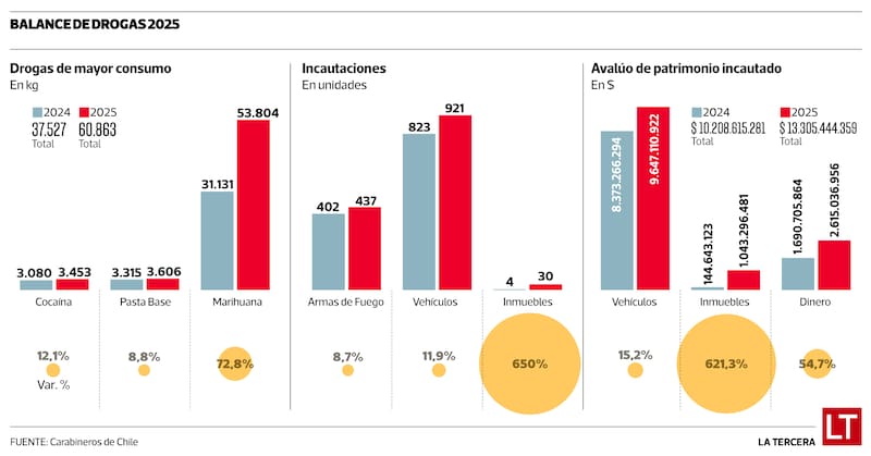 En términos económicos, lo incautado durante 2025 se avalúa en un total de $ 13.305.444.359, un 30,3% más que en 2024. En específico, el mayor aumento (621,3%) se da en los inmuebles, mientras que los vehículos representan más de $ 9.600 millones.