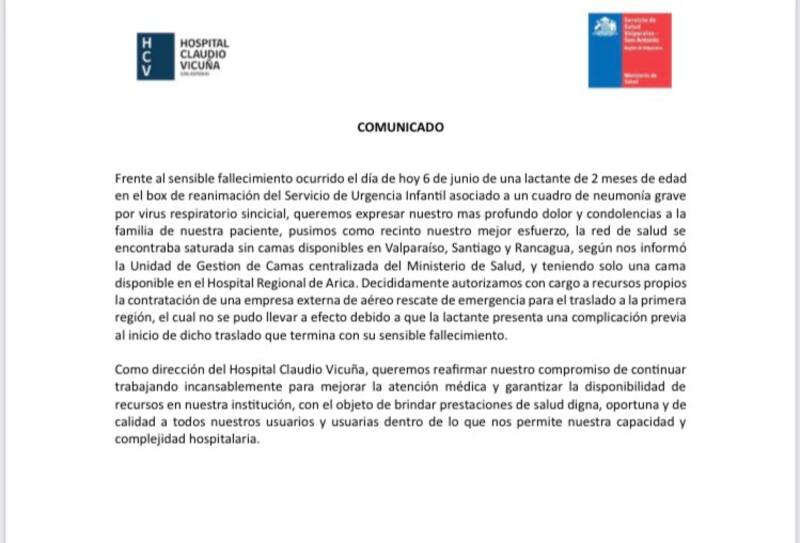 Durante esta jornada el Hospital Claudio Vicuña, ubicado en San Antonio, informó sobre el “sensible fallecimiento de una lactante de dos meses de edad en el box de reanimación del Servicio de Urgencia Infantil asociado a un cuadro de neumonía grave por virus respiratorio sincicial”, expresando “profundo dolor” y enviando las condolencias a la familia de la paciente.