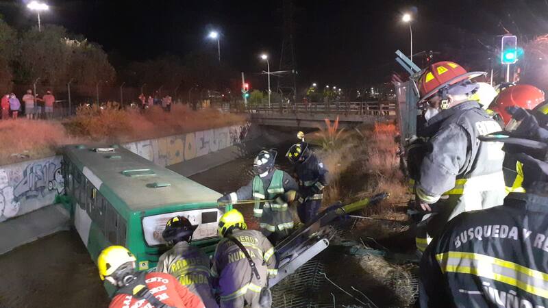 Durante la noche de este jueves, un bus del transporte público cayó al Zanjón de la Aguada, en la comuna de Macul.