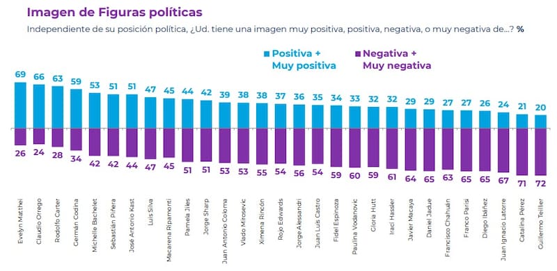 Por otra parte, las tres figuras políticas mejor evaluadas son la alcaldesa de Providencia, Evelyn Matthei, con 69% de imagen positiva, seguida por el gobernador de la Región Metropolitana, Claudio Orrego (66%) y el jefe comunal de La Florida, Rodolfo Carter (63%). En el otro extremo, los peor evaluados son el senador y timonel de Revolución Democrática (RD), Juan Ignacio Latorre (24%), la diputada Catalina Pérez (21%) y el presidente del PC, Guillermo Teillier (20%).