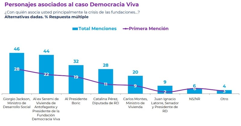 Al respecto, un 46% de los consultados asocia principalmente esta crisis de las fundaciones con el ministro de Desarrollo Social, Giorgio Jackson; seguido por los involucrados directos en el caso, el ex seremi de Vivienda de Antofagasta, Carlos Contreras y el representante legal de Democracia Viva, Daniel Andrade, con un 44%.