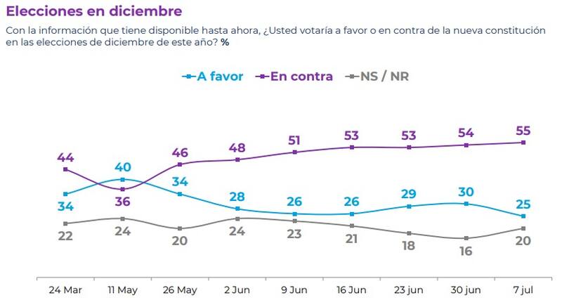 En torno al proceso constituyente, aumentó a un 55% quienes aseguran que votarán en contra de la nueva Constitución en las próximas elecciones de diciembre de este año, mientras que se registró una baja de 30% a 25% quienes afirman que aprobarán la propuesta. Asimismo, el porcentaje de indecisos subió de 16% a 20%.