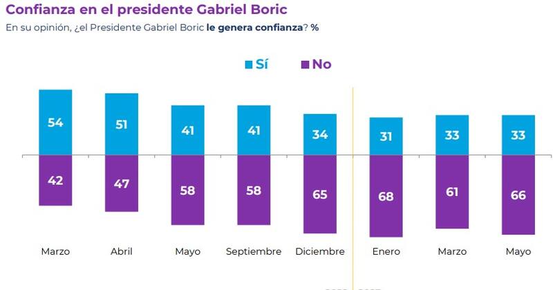 Además, en la última semana de mayo, se registró un leve incremento en la aprobación a la gestión del Presidente Gabriel Boric, la cual llegó al 31%, mientras que su desaprobación bajó al 61%.