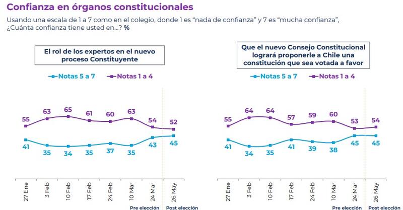 En cuanto a la confianza que representa el trabajo de este último órgano, un 52% lo evalúa con notas que van del 1 al 4, panorama similar que refleja la labor que llevará a cabo el nuevo Consejo Constitucional, donde un 54% lo califica con notas que van en el mismo rango.