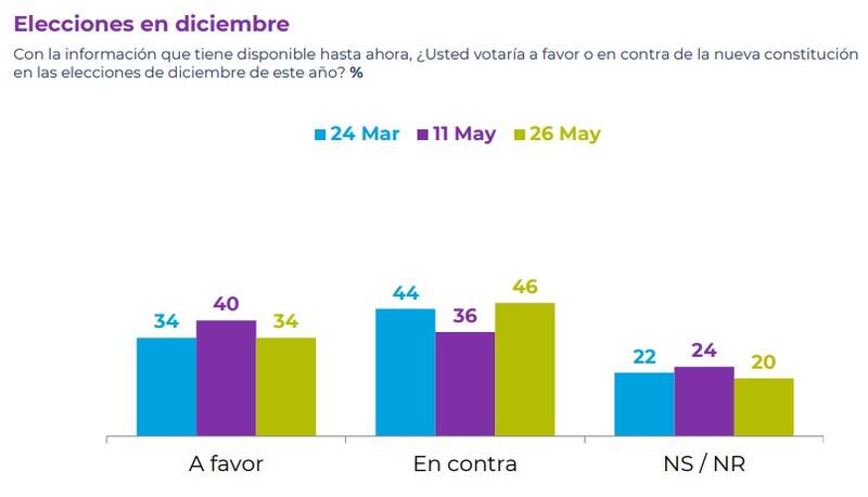Lo anterior se traduce en un aumento de diez puntos porcentuales respecto a lo evidenciado hace dos semanas (36%). En tanto, bajó de un 40% a un 34% entre quienes aprobarían dicho texto, y un 20% no sabe o no responde.