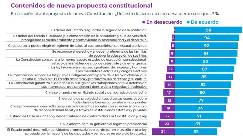 Asimismo, un 85% está de acuerdo con el reconocimiento a los pueblos indígenas como parte de la nación chilena, que es una e indivisible, 80% con que Chile se organiza en un Estado social y democrático de derecho y 77% con el derecho de propiedad.