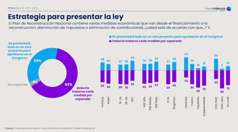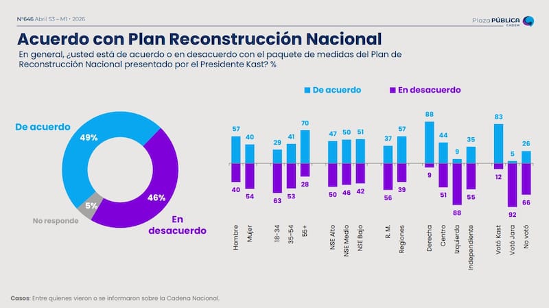 El sondeo, en un adelanto de su entrega semanal, consultó: “En general, ¿está de acuerdo o en desacuerdo con el paquete de medidas del Plan de Reconstrucción Nacional presentado por el Presidente Kast?”. Frente a ello, un 49% se mostró a favor, principalmente hombres (57%), personas mayores de 55 años (70%) y quienes se identifican con la derecha (88%).