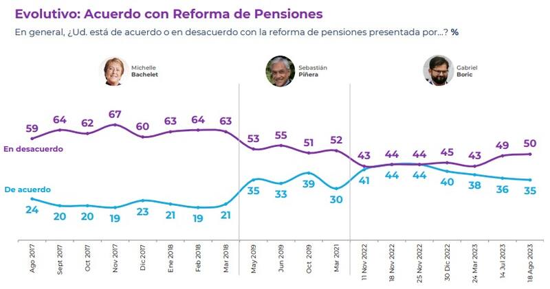 Este domingo se conocieron los resultados de la encuesta Plaza Pública, que realiza Cadem, correspondiente a la tercera semana de agosto, los cuales arrojaron que un 50% de las personas consultadas está en desacuerdo con la reforma de pensiones, proyecto que fue presentado por el Presidente Gabriel Boric en noviembre del año pasado.
