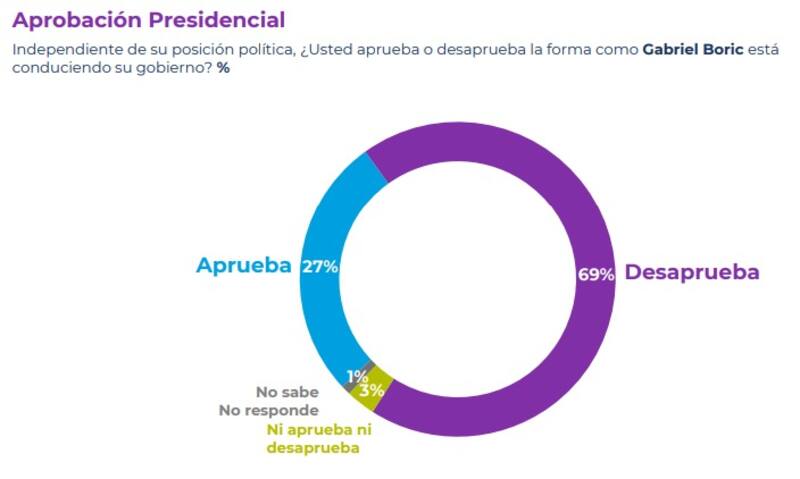 En la tercera semana de agosto, se evidenció un aumento de tres puntos porcentuales en la desaprobación a la gestión del Presidente Gabriel Boric, la cual alcanzó el 69%. En tanto, su aprobación consignó una mínima baja de 28% a 27%.