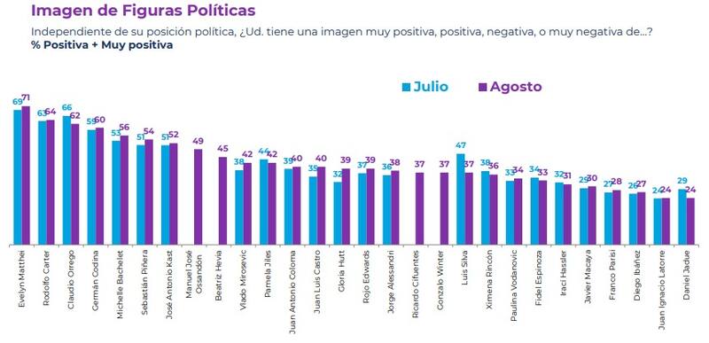 En cuanto a otras figuras políticas, la alcaldesa de Providencia, Evelyn Matthei se alza con el 71% en imagen positiva, seguida por el jefe comunal de La Florida, Rodolfo Carter (64%) y el gobernador de la Región Metropolitana, Claudio Orrego (62%).