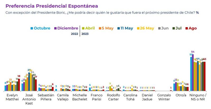 Finalmente, la alcaldesa de Providencia subió cuatro puntos en preferencia presidencial espontánea, llegando al 18%, superando por primera vez al líder de Republicanos, José Antonio Kast, que obtuvo un 17%, completando un retroceso de 10 puntos desde mayo.
