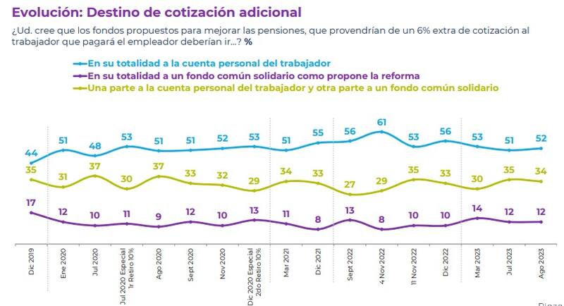 En torno a los fondos propuestos para mejorar las pensiones, los que provendrán del 6% extra de cotización que deberá pagar el empleador, solo un 12% piensa que debiese ir en su totalidad a un fondo común solidario, tal como propone la reforma; mientras que un 52% piensa que debiese ir en su totalidad a la cuenta personal de cada trabajador.