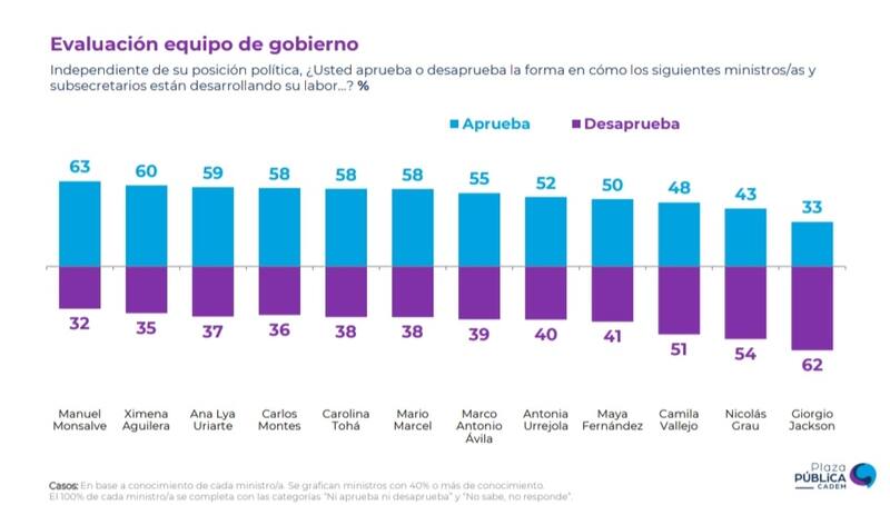 En la vereda contraria, los últimos tres lugares son ocupados por la ministra de la Secretaría General de Gobierno (Segegob), Camila Vallejo, con un 51% de desaprobación, el ministro de Economía, Fomento y Turismo, Nicolás Grau, con un 54%, y el ministro de Desarrollo Social, Giorgio Jackson, con un 62%.