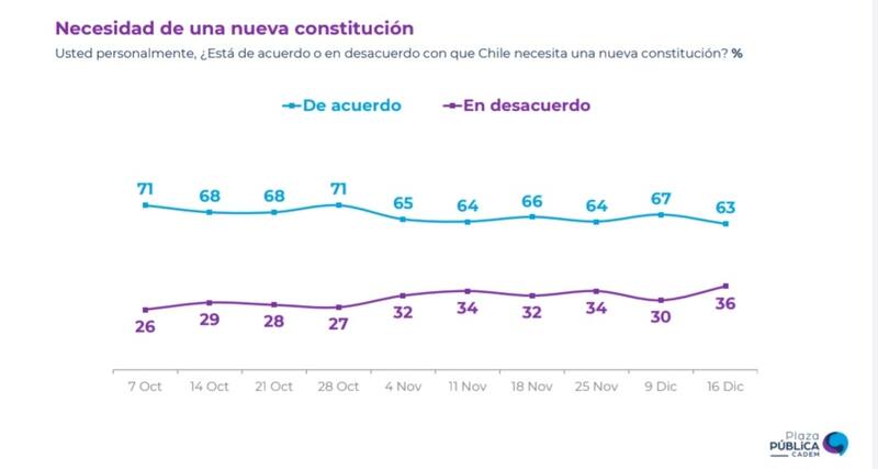 Según se extrae del sondeo de opinión, que corresponde a la tercera semana de diciembre, un 63% cree que el país necesita una nueva Constitución, mientras que un 36% piensa que no es necesario.