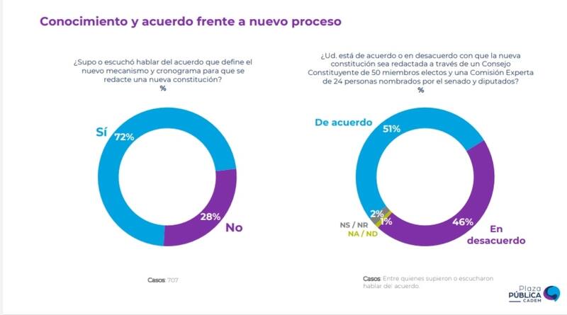 Este domingo se conocieron los resultados que arrojó la última versión de la encuesta semanal Plaza Pública, que realiza Cadem, estudio que reveló que un 51% de los encuestados está a favor de que la nueva Constitución sea redactada por 50 constituyentes electos y 24 expertos -12 designados por cada una de las cámaras del Parlamento-, mientras que un 46% está en contra de que la nueva Carta Magna sea redactada por el llamado “Consejo Constitucional”.