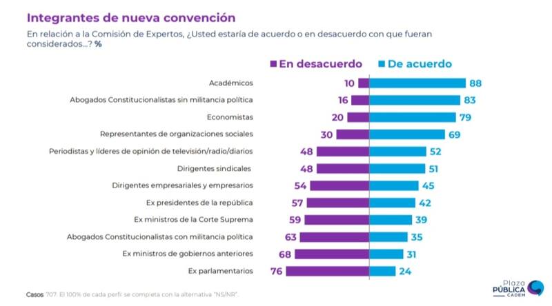 Sobre los integrantes que conformarán el denominado “comité de expertos” del nuevo órgano constitucional, un 88% prefiere que sean académicos, un 83% se inclina por abogados constitucionalistas sin militancia política y, en tercera preferencia, con un 79%, están los economistas. Por el lado contrario, un 76% expresa que el comité no debería estar integrado por exparlamentarios, un 68% rechaza la presencia de exministros de gobiernos anteriores y un 57% se opone a la presencia de los expresidentes de la República dentro del órgano.