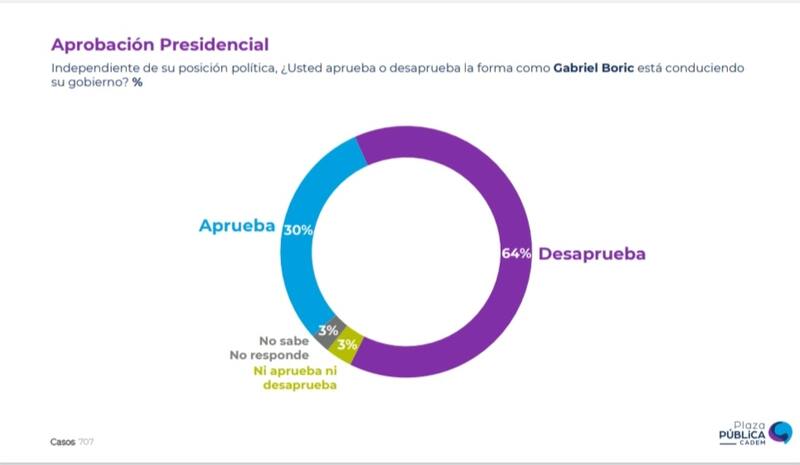 El sondeo de opinión reveló, además, que un 30% de los encuestados aprueba el liderazgo del Presidente Boric, mientras que un 64% desaprueba la gestión del mandatario.
