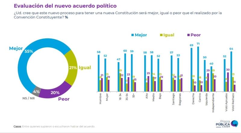 En tanto, dijeron estar en contra del acuerdo un 57% de los identificados con la izquierda, el 51% de los jóvenes y el 53% de quienes votaron Apruebo en el plebiscito pasado.