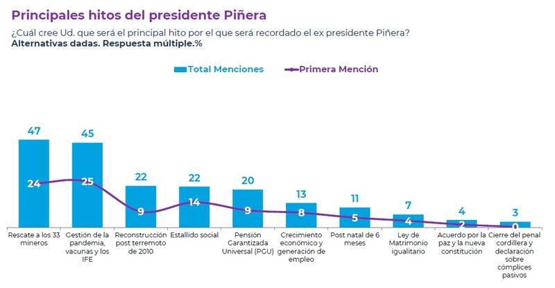 Los principales hitos por los que Piñera será recordado son el rescate a los 33 mineros (47%) y la gestión de la pandemia, las vacunas y el Ingreso Familiar de Emergencia IFE (45%), y el estallido social (22%).