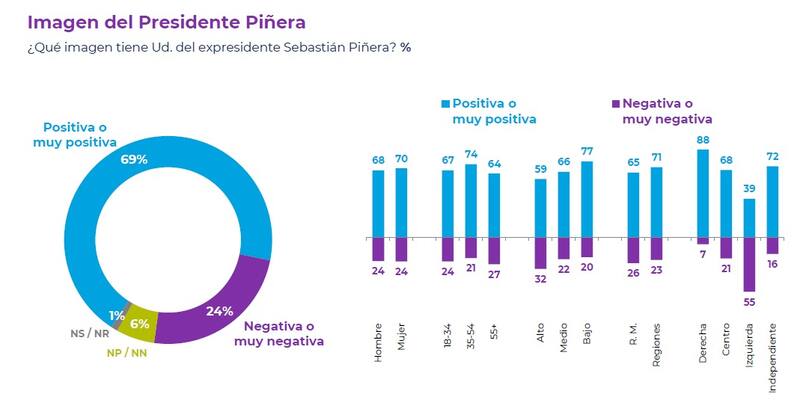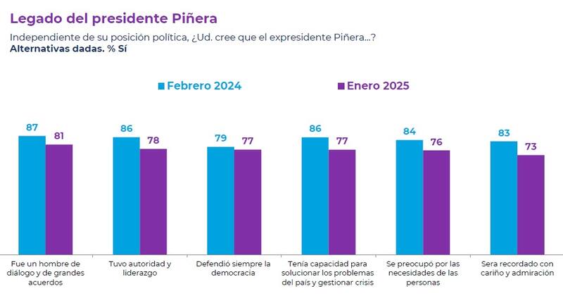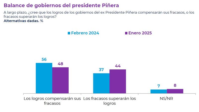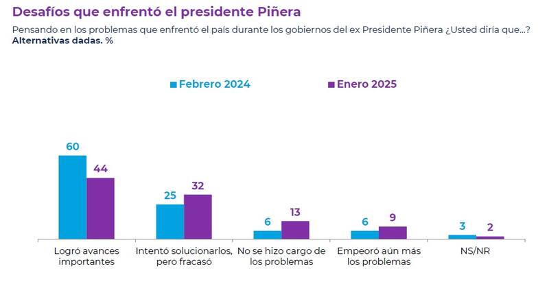 De igual forma, cayó de un 60% a un 44% la percepción de que el expresidente Piñera logró avances importantes en los desafíos que enfrentó, mientras que aumentó de un 25% a un 32% la idea de que los problemas que tuvo intentó solucionarlos, pero fracasó.