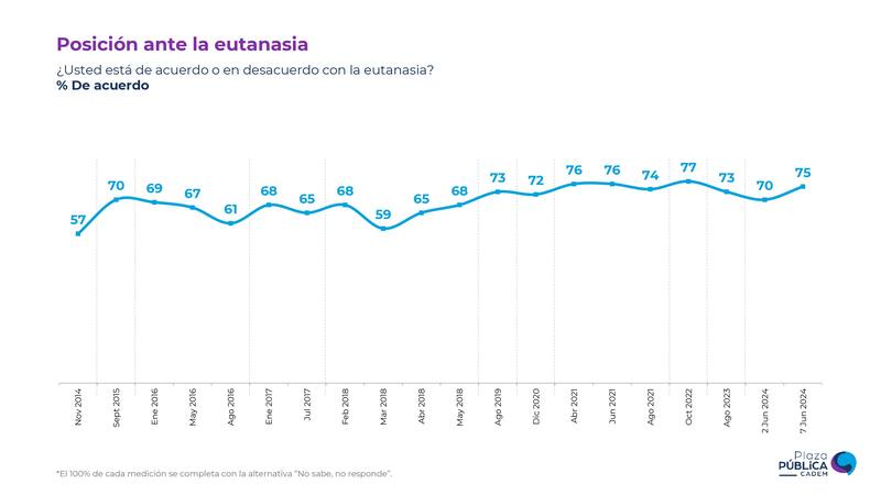 Asimismo, la eutanasia aparece respaldada por el 75% de los consultados, mostrando un aumento de cinco puntos en relación a la medición de la semana pasada. En el mismo punto un 82% está de acuerdo en poder autorizar a los médicos a asistir a alguien en caso de enfermedad dolorosa e irremediable. Un 16% está en contra.