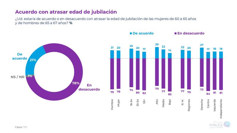 El sondeo también consultó respecto a la posibilidad de retrasar la edad de jubilación. A la pregunta “¿usted estaría de acuerdo o en desacuerdo con atrasar la edad de jubilación de las mujeres de 60 a 65 años y de hombres de 65 a 67 años?”, un 78% se mostró en contra y solo un 21% estaría a favor de una medida de ese carácter.