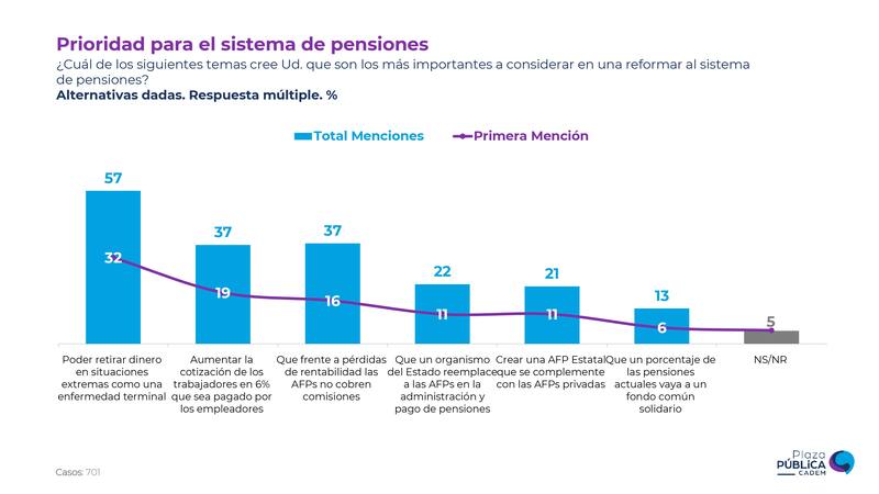Respecto a la principal prioridad a considerar en el contexto de la reforma previsional, un 57% del total de las menciones respalda que se posibilite hacer el retiro del dinero de los fondos en situaciones extremas, como una enfermedad terminal. Empatadas con un 37% aparece que el aumento del 6% sea con cargo al empleador y que, frente a las pérdidas de rentabilidad de las AFP, estas no cobren comisiones a los cotizantes.