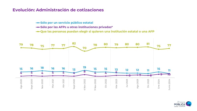 Asimismo, un 77% de los encuestados se mostró a favor de que los cotizantes puedan decidir si la entidad que administra los fondos de pensiones sea una institución estatal o continuar con las Administradoras de Fondo de Pensiones (AFP). Un 10% solo respalda que los fondos sean gestionados por entidades privadas y un 11% que lo haga un servicio estatal.