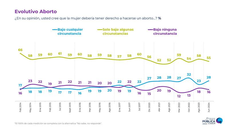 Respecto al primer punto, solo un 28% de los encuestados respalda la posibilidad de interrumpir un embarazo bajo cualquier circunstancia y un 55% cree que debe realizarse bajo algunos criterios. Un 16% no valida esta posibilidad.