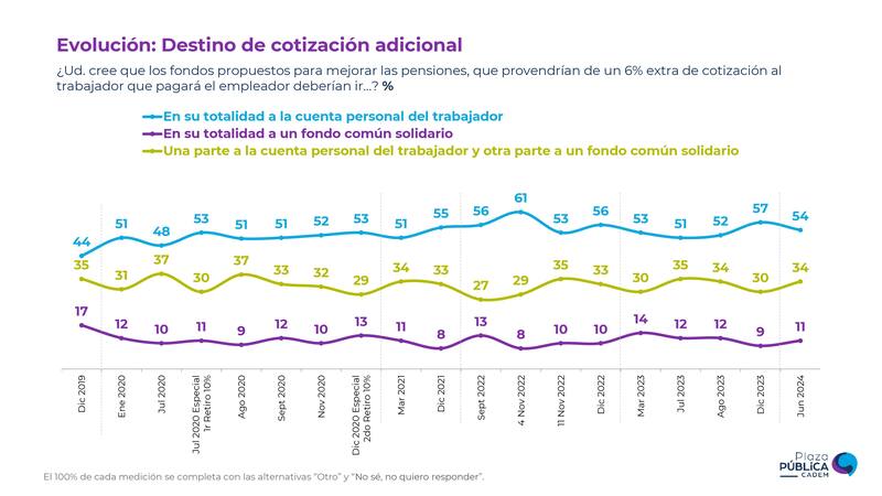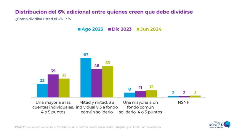En ese aspecto, lun 53% apoya que se divida esta cotización adicional en 3% para la cuenta individual y el otro 3% a un fondo solidario, opción que aumentó en cinco puntos desde la medición anterior.