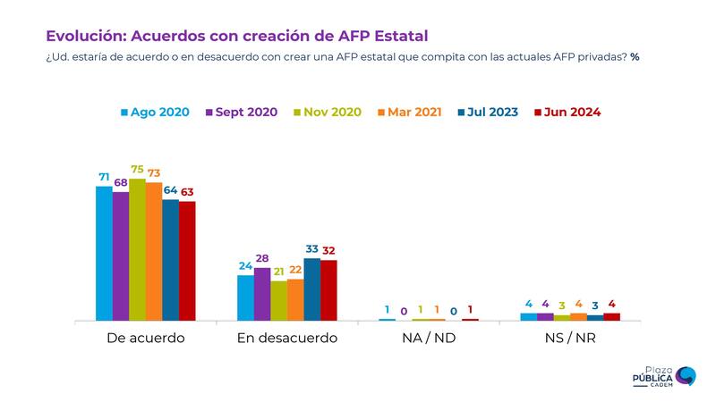 A la vez, un 63% de los encuestados está de acuerdo con la creación de una AFP estatal que compita con las entidades privadas, un número que ha ido a la baja desde la medición de marzo de 2021, cuando bajó de un 75% a un 73%. A su vez, un 32% está en contra de esta iniciativa.