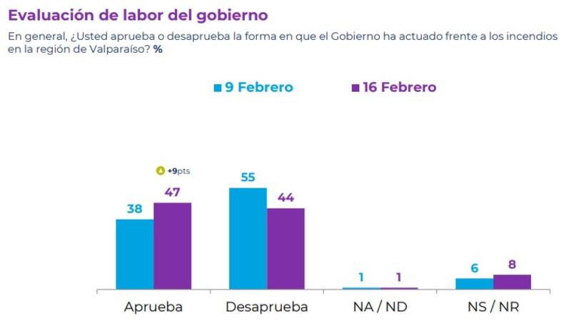 Por otra parte, la encuesta arrojó un aumento de nueve puntos en la última semana, de 38% a 47%, entre quienes aprueban la forma en que el gobierno ha actuado frente a los incendios en la Región de Valparaíso, así también como un desplome de once puntos, de 55% a 44%, entre quienes la desaprueban.