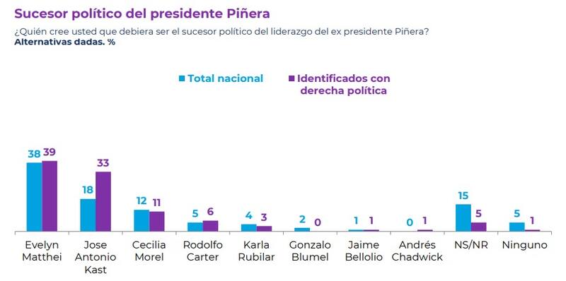 Asimismo, y según el sondeo, Matthei también es considerada como la principal sucesora política del liderazgo del fallecido expresidente Sebastián Piñera, con un 38%. Le sigue José Antonio Kast (33%) y Cecilia Morel (11%).